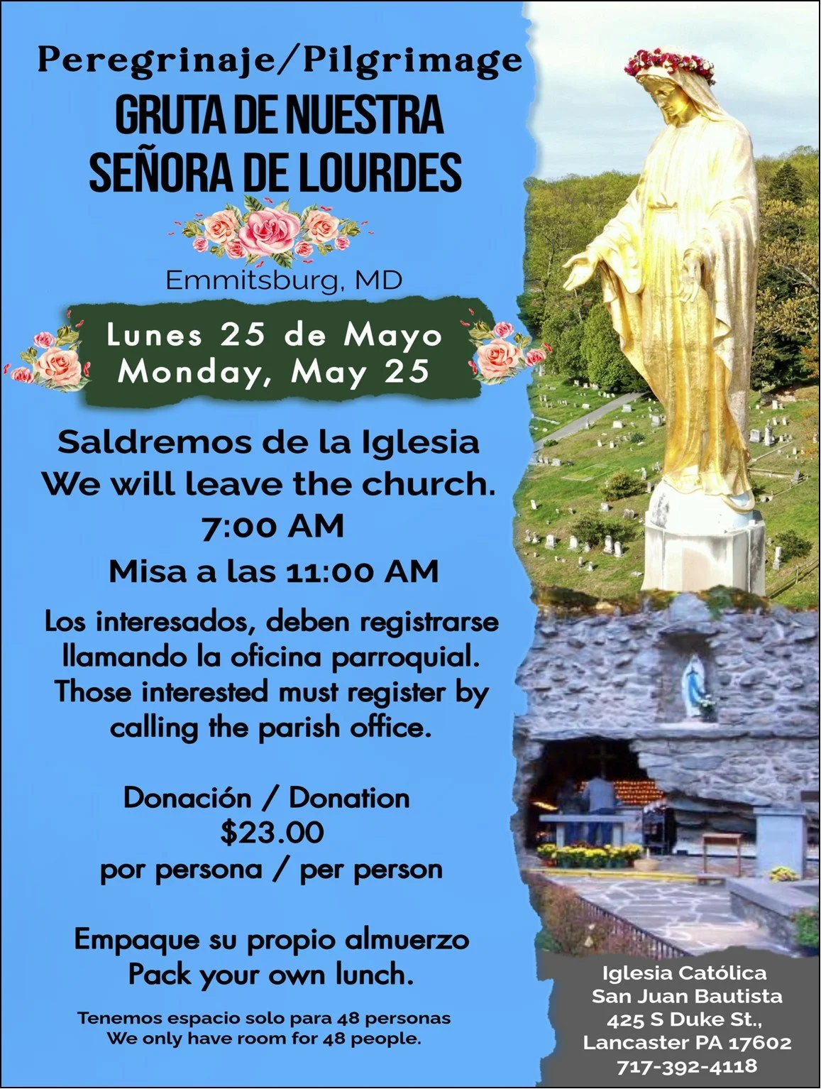 La Iglesia Católica San Juan Bautista es la única parroquia hispana en la Diócesis de Harrisburg, dedicada en particular a las necesidades espirituales y temporales de los Hispanos en el Condado de Lancaster. El 24 de junio de 2017 comenzamos nuestro Decimoquinto año como una parroquia hispana oficial, pero nuestras raíces en San Juan Bautista van mas de 35 años en crecimiento.